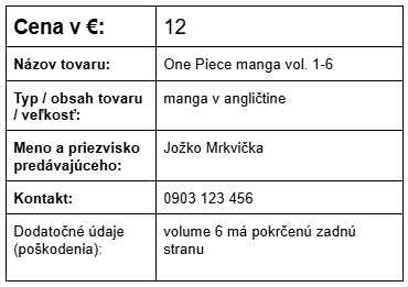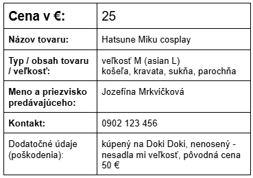 Riadne oštítkovaný (viď oficiálny štítok) - cena, názov tovaru, meno predajcu a kontakt na neho (tel.č.), typ tovaru / čo obsahuje, veľkosť (napr. pri cosplayi, odporúča sa pridať aj foto celého cosplayu), prípadné poškodenia, či iné dodatočné info.